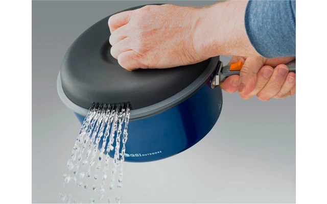 Das Set enthält 2 Töpfe, eine Bratpfanne, 2 Nylonsiebdeckel, ein gewölbtes Schneidebrett für eine Vielzahl von Vorbereitungen, einen klappbaren Topfgriff und einen geschweißten Packsack, der für Ordnung sorgt und gleichzeitig als Waschbecken dient.