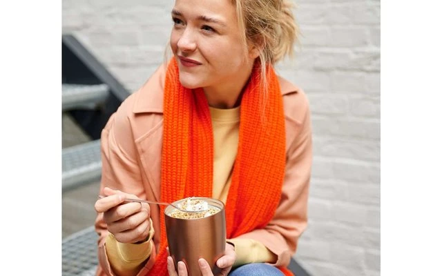 Ob auf der Arbeit oder unterwegs im Zug: Einfach kurz vorher beide Zutaten mischen und… genießen! Auch beim Spätdienst oder Nachmittagsunterricht hilft der Lunchpot, den Hunger zu stillen. Denn die morgens eingefüllte Suppe ist immer noch heiß. Und die knusprigen Croutons aus dem Deckel sind eine perfekte Just-in-time-Zutat. Der Thermo-Lunchpot hält Speisen bis zu 6-8 Stunden* warm und 12 Stunden kalt.