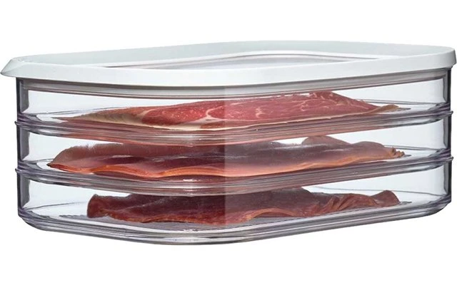 Der transparente Deckel mit weißem Rand und Dichtungsring sorgt für einen perfekten Verschluss, wodurch diese Modula Dosen ideal geeignet sind für die Aufbewahrung von verschiedenen Wurst- und Fleischwaren.