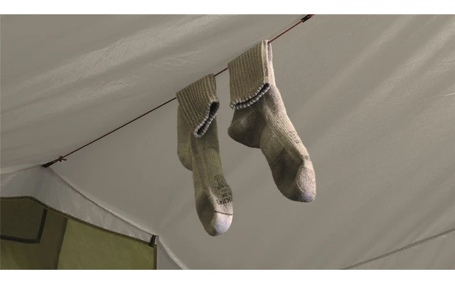 Vom Innenzelt aus gibt es einen Zugang zu einem zusätzlichen Aufbewahrungsbereich am Ende des Zelts. Dieser Zugang ist mit einem Reißverschluss versehen. Ergänzt werden diese Aufbewahrungsmöglichkeiten durch Netztaschen und eine Ausrüstungsleine.