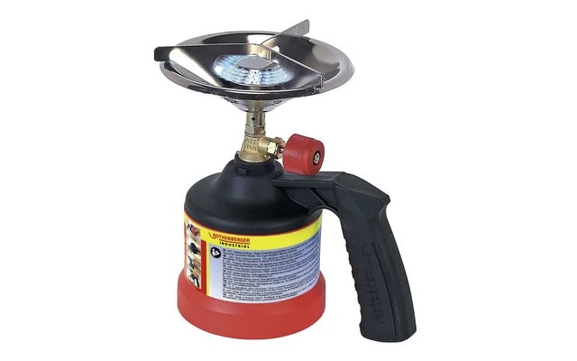 Sicherer Stand mit Haltegriff; Dreipunkt Topfauflage – kippsicher; Topfauflage, Brenner und Windschutz aus oberflächenveredeltem Metall; stabiles Kunststoffgehäuse