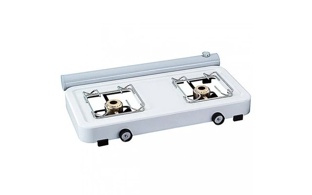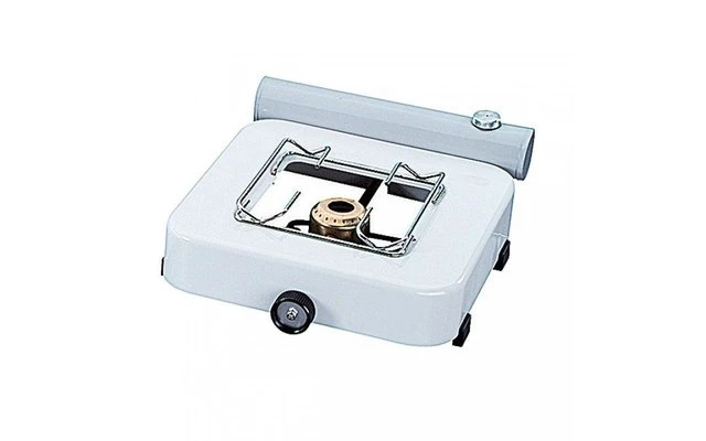 Spirituskocher aus lackiertem Stahlblech und regelbarer Flamme und Topfrost.